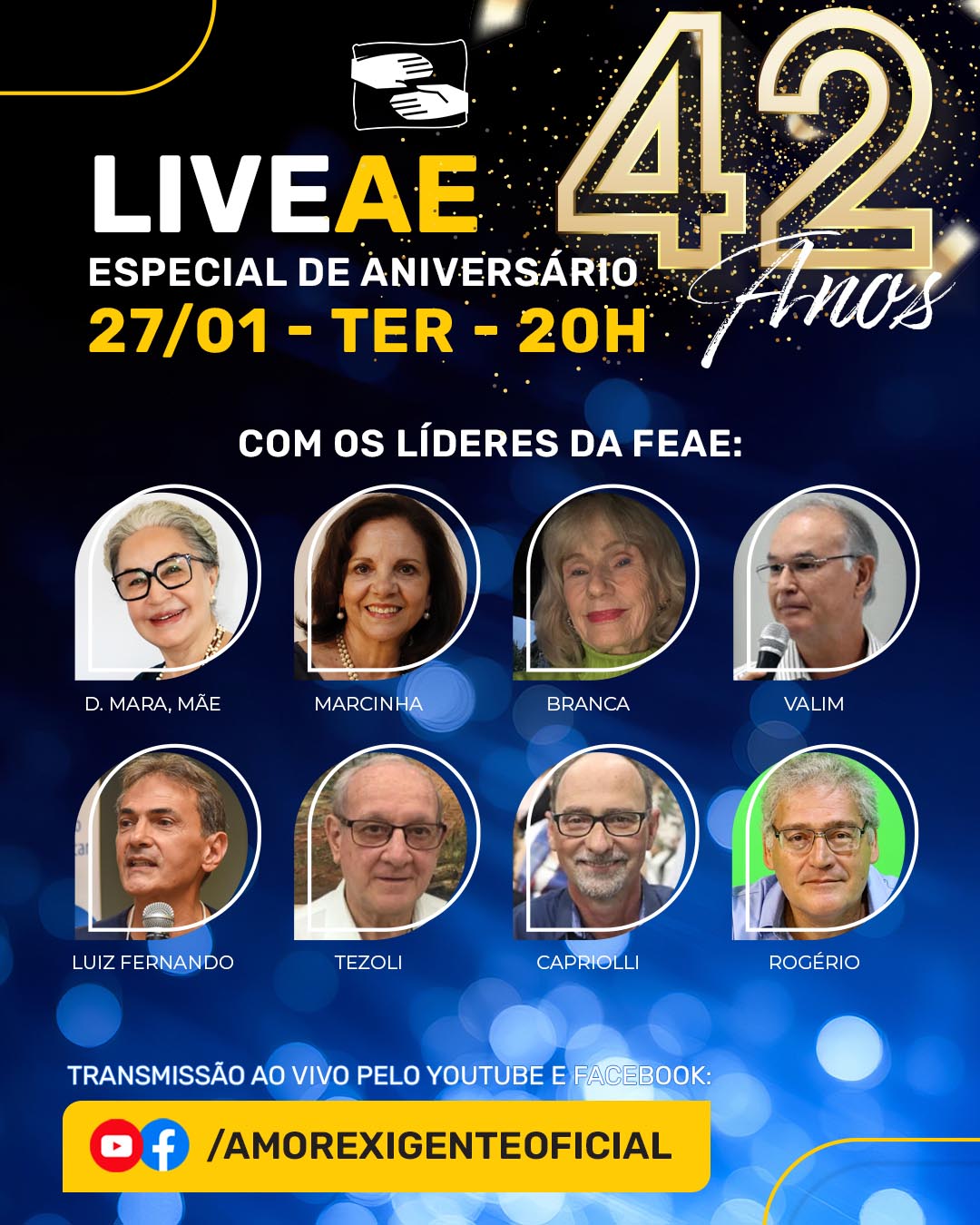 Live de Celebração pelo aniversário de 42 anos do Amor-Exigente. Presença da cofundadora Mara Menezes e toda a diretoria da FEAE.