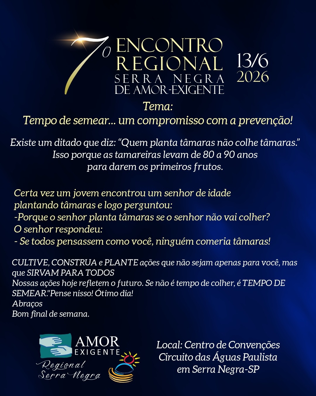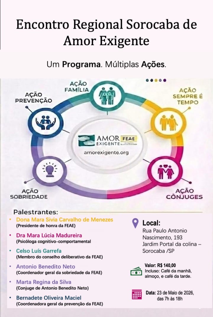 Seminário Amor Exigente - 2026 A regional Pelotas convida você para participar do Seminário Amor Exigente - 2026, que acontecerá nos dias 22,23 e 24 de maio de 2026, no Santuário Guadalupe, Cascata - Pelotas/RS. Com o tema Amor Exigente em Busca de Vida Saudável e Esperança. O Seminário é um momento de formação, reflexão e fortalecimento […]